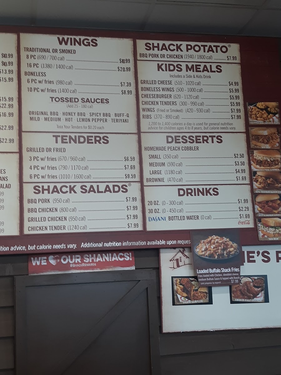 Start your feast with the irresistible Shack Baskets featuring Fried or Grilled Chicken Tenders, Smoked Wings, and fall-off-the-bone Ribs. Each basket is complemented by two sides and a refreshing drink. For families, the impressive Family Meals serve up a delicious array of offerings, including the Tender Family Meal and the hearty Family Feast, perfect for sharing.